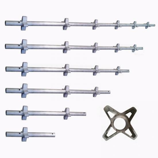 Kwikstage standards, which serve as vertical supports, are constructed from standard scaffold tubes with a diameter of 48.3 mm and a wall thickness of either 4 mm or 5 mm, as per customer requirements. These standards are equipped with "V" pressed weldings at nominal 495 mm centers, providing connection points for ledgers and transoms. Welded bottom cups made from high-quality steel and mobile, captive top cups of malleable casting ensure a robust connection to ledger blades, designed for durability in demanding site conditions.